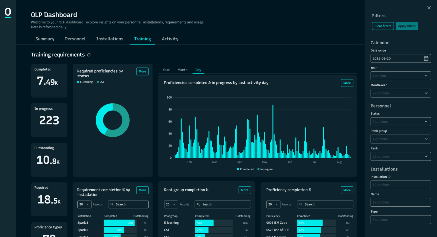 Get a clear view of training completions and competence across your fleet with easy-to-understand data visualisations. Monitor progress by vessel, role, or individual, and use remote e-learning and flag-approved STCW courses to close gaps before they become issues.