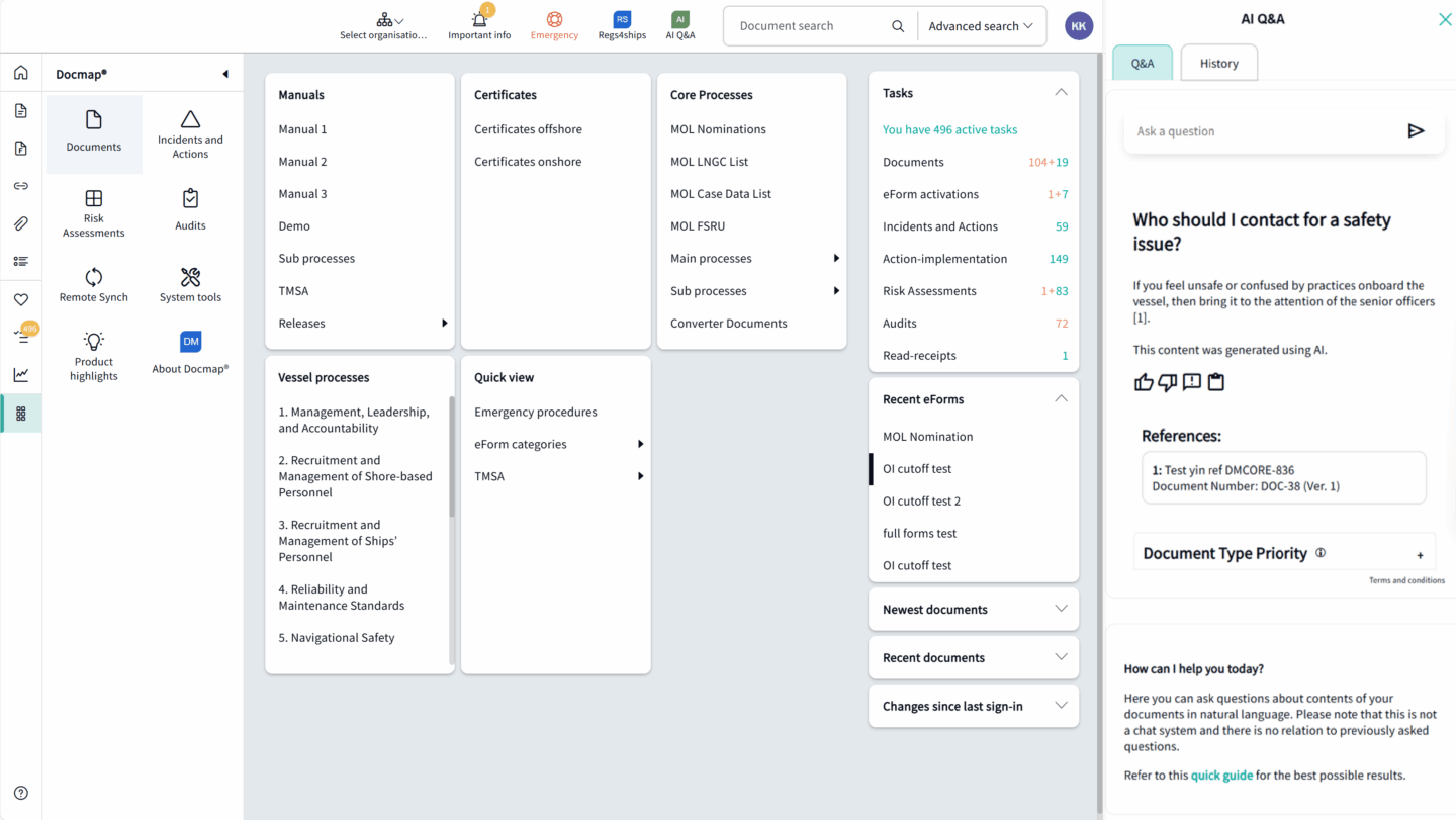 Docmap centralises your entire Safety Management System (SMS) and streamlines quality, health, safety and environment (QHSE) requirements – covering ISM Code policies, checklists, risk assessments, and corrective actions – into one live, linked system. You get clear oversight and confidence that both crew and shore teams are working from accurate, up-to-date information, without delays or uncertainty.